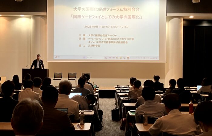 2025年9月11日(木)、大学の国際化促進フォーラム特別会合「国際ゲートウェイとしての大学の国際化」をベルサール飯田橋駅前1階イベントホールにて開催しました。今回の特別会合は、大学の国際化促進フォーラム会員校を対象として、ソーシャルインパクト創出のための多文化共修キャンパス形成支援事業採択校連絡会の共催、文部科学省の協力を得て開催されました。当日は、全国44大学から106名の方にご参加をいただきました。ご参加いただきました皆様に心より御礼申し上げます。当日実施したプログラムの概要は以下の通りです。